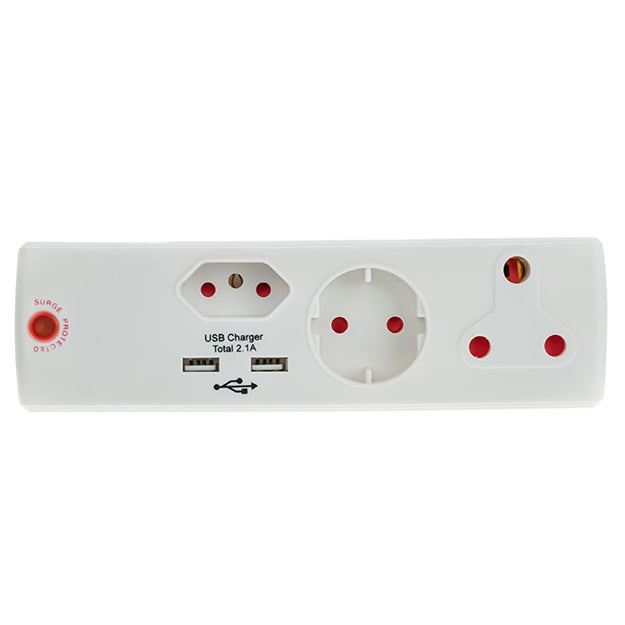 • 1 x ELECTRICMATE 1 x 16 AMP + 1 x 5 AMP + 1 x SCHUKO + 2.1 AMP USB Surge Adaptor