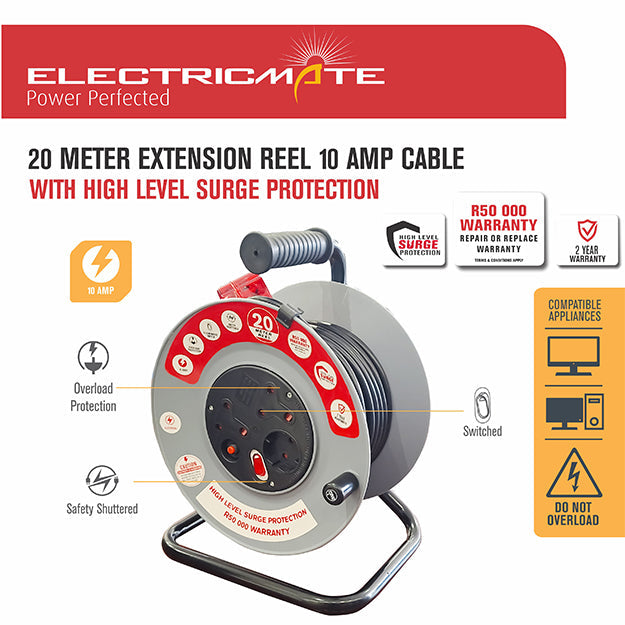 The ELECTRICMATE 20M 10 Amp High-Level Surge Extension Reel is designed to provide a reliable and safe power source for your high-powered devices. This 20-meter extension reel features a 10 Amp capacity, integrated into a durable steel cassette for easy storage and mobility. The built-in high-level surge protection ensures your electronics are safeguarded against power surges and spikes.