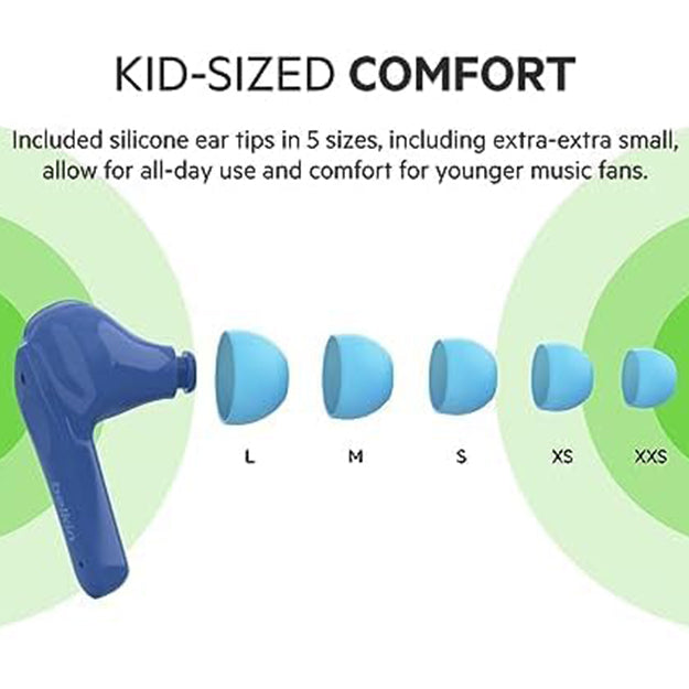 They offer a comfortable fit, safe listening levels, and long battery life. A volume cap of 85dB protects kids' ears while they listen, learn, and play. There's up to 5 hours of playtime in the earbuds, plus another 19 hours of battery life in the charging case. IPX5-rated materials protect the earbuds' inner technology from sweat, puddle splashing, and occasional dashes in light rain. A high-quality microphone in each earbud ensures clear call quality so it feels like you're speaking to each other in the same room. Each wireless Bluetooth earbud responds easily to touch control. Kids can enjoy wire-free, button-free audio controls for volume, phone calls, and to skip or pause songs. Comes in blue color.
