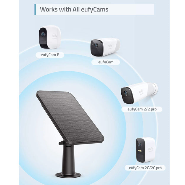 Provide continuous charging for your eufyCam, eufyCam E, eufyCam 2, eufyCam 2 Pro, eufyCam 2C, or eufyCam 2C Pro.