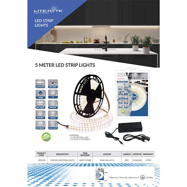 The LITEMATE LED Strip Light 5M White is a versatile and energy-efficient lighting option perfect for enhancing any space. With its sleek white light, this LED strip is ideal for accent lighting, under cabinets, or creating a modern atmosphere in your home or office.