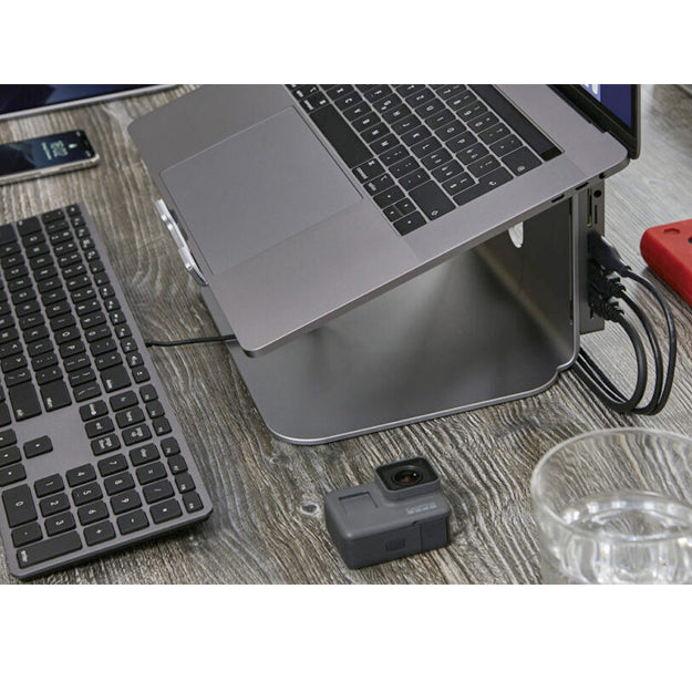 The CASA Hub Stand combines a laptop stand with a USB-C 5-in-1 connectivity hub with an adjustable 0°~180° tilt design for perfect eye-level screen position and comfortable keyboard typing angle. Features Silicon pads for enhanced grip and scratch protection along with a convenient, foldable, and portable design. Comes with a nylon braided cable with a 90° L-shaped USB-C connector for relieving cable bending stress and easy connection.