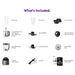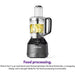 The food processor attachment is fully equipped with a 7-cup work bowl, dual-size food pusher, and blades for slicing, shredding, chopping, and kneading dough. Blades stack neatly inside the work bowl when not in use.