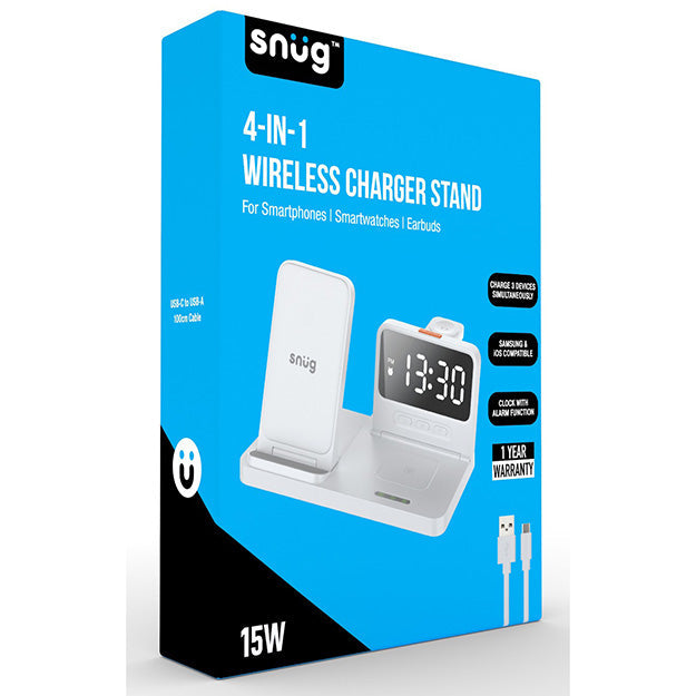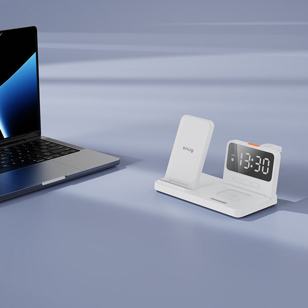 Declutter your nightstand and power up in style with the Snug 4-in-1 Wireless Charger Stand – the ultimate all-in-one charging solution for your smartphone, smartwatch, and earbuds.