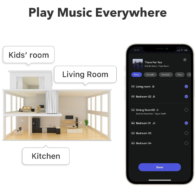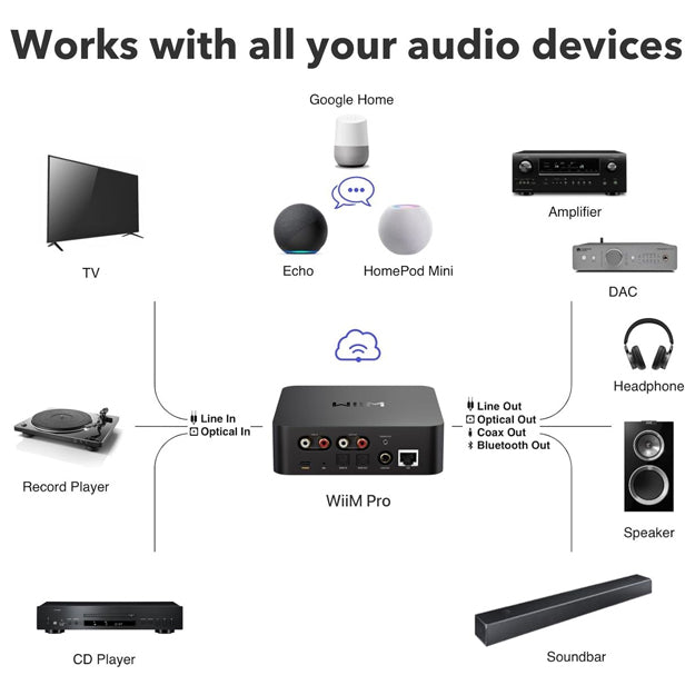 Easily build your multiroom sound system with your existing AirPlay 2 speakers, Amazon Echo, and Google Home devices. Using your legacy audio devices, you can create a more flexible multiroom sound system with multiple WiiM Pros, WiiM Minis, or Linkplay-powered devices. WiiM Pro supports multiroom from various audio source inputs, including WiFi, BT, Aux, and SPDIF input, making it versatile with almost every music listening option.
