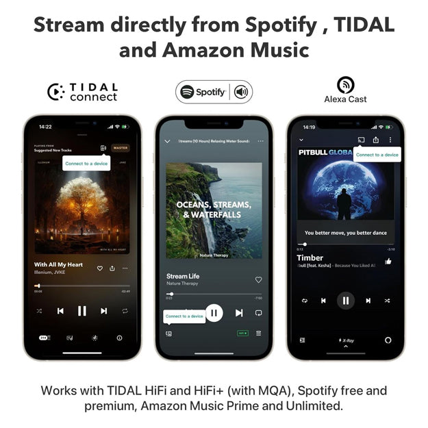 Offering more streaming services and audio content that incorporate MP3 quality, lossless audio, or immersive sound technologies for their listeners. WiiM devices provide the capability to play Hi-Res lossless audio contents from Spotify, Amazon Music, TIDAL, Deezer, Qobuz and more. It supports up to 192kHz, 24-bit audio output which is the same as artist's recording in the studio . The integrated TI stereo DAC provides the high quality analog audio output with the 106-dB SNR, dynamic range and -92dB THD+N performance, outstanding in all audio categories.